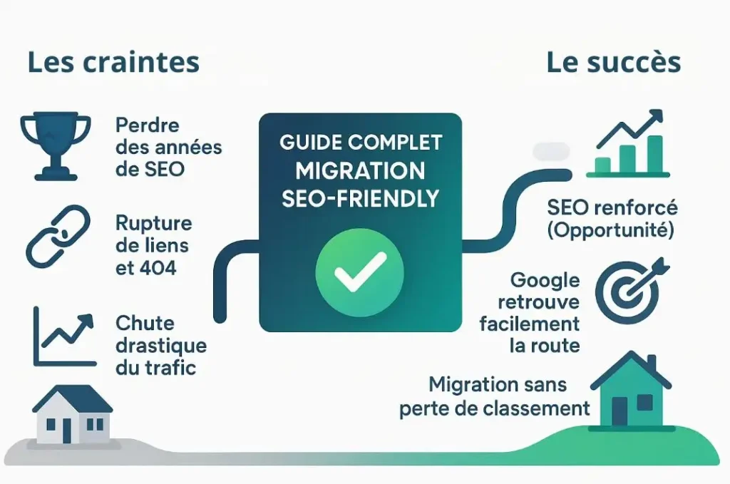 Bien préparée (80% du succès), elle prévient les baisses du trafic et peut même booster votre référencement. L’enjeu ? ? Conserver votre autorité Google et transformer ce changement en opportunité de croissance.