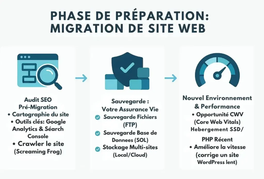 Le guide complet couvre aussi la préparation critique, le choix d’un hébergeur boosté Core Web Vitals, et les vérifications post-migration. Parce qu’une migration réussie, c’est bien plus qu’un simple copier-coller : c’est transformer un risque en opportunité.